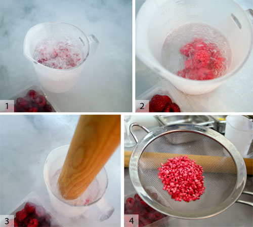 將樹莓分開。1)在液氮中放入一些覆盆子(確保足夠)。2)等待劇烈的沸騰停止-現(xiàn)在漿果一直被冷凍。您可以根據(jù)需要減少凍結(jié),但是硬凍結(jié)使您的工作時間更長。3)用a面杖搗碎漿果。4)應(yīng)變。