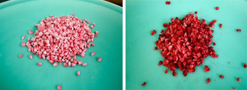 覆盆子融化前后。在融化之前不要嘗試吃它們,但要確保在它們結(jié)實的時候?qū)⑺鼈冨兩稀H诨氖谴嗳醯摹?/p>